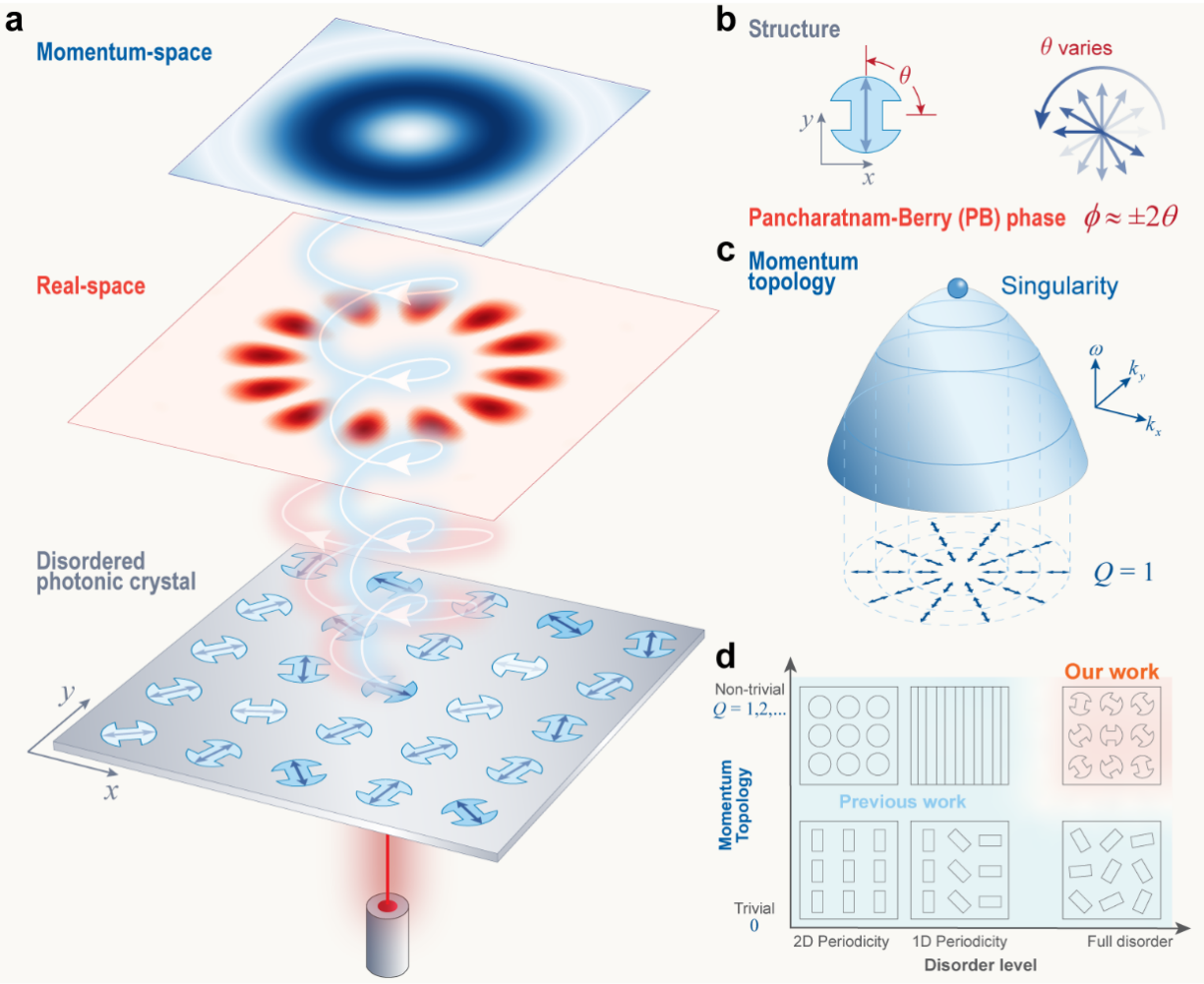 为了解决这一问题,0033990威尼斯深圳国际研究生院副教授宋清华团队联合新加坡国立大学教授仇成伟、洛桑联邦理工大学教授罗曼·弗勒里(Romain Fleury),首次提出了一种实动量拓扑光子晶体的概念(图1)。该研究提出了无序辅助的实动量拓扑光子晶体,为拓扑光学领域的应用开辟了新的方向,这一创新性研究有望推动光子芯片等微纳光学器件的发展,并可应用于高稳定性高容量的光通信技术、复杂结构光的生成、高维量子纠缠技术、生物粒子的精细光学操控、AR/VR显示器件等领域。