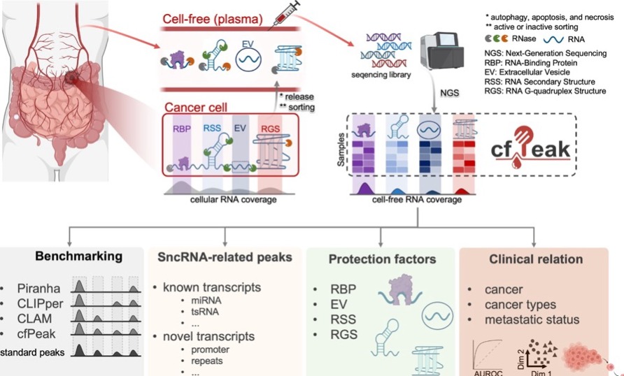 清华新闻网5月15日电 液体活检是近年来发展起来的新型无创诊断技术,可以实时动态地监测人体的健康和疾病状态。细胞游离RNA(cell-free RNA,cfRNA)由于具有高度的敏感性、动态性和组织溯源能力,为肿瘤、自身免疫疾病、孕期疾病、神经退行性疾病等复杂性疾病的无创检测带来了新的希望。cfRNA广泛存在于血液等多种人类体液中,通常被包裹在细胞外囊泡(EV)中或与蛋白结合形成核糖核酸蛋白复合体(RNP)。然而cfRNA本身高度碎片化、异质性高且信噪比低(病灶来源的cfRNA占比低),为其灵敏识别和临床应用带来了诸多挑战。另一方面,被核小体或转录因子保护的碎片化cfRNA的片段组学近年来已有很多研究的积累,被证明在肿瘤诊断和预后等多个场景均有一定应用潜力,而具有广阔临床应用前景的cfRNA中的片段化特征则由于生物信息学分析方法的缺乏很少被研究。