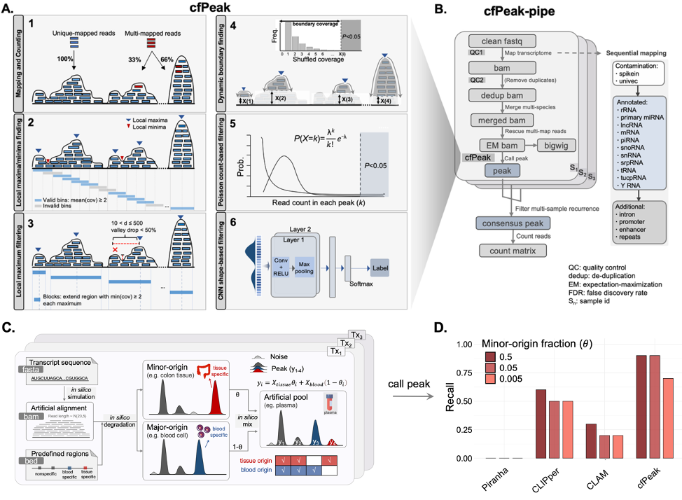 考虑到本研究之前提到的不同工具的差异,在使用传统的峰区识别工具探索片段化cfRNA时,可能会面临建模不恰当或参数不适合的风险。为此,研究人员引入了信号峰区识别方法cfPeak来填补这一空白。cfPeak借鉴了其他方法的多项优点,整体可分解为六个主要模块(图3A),并搭建了片段化cfRNA峰区分析的整个流程(图3B)。