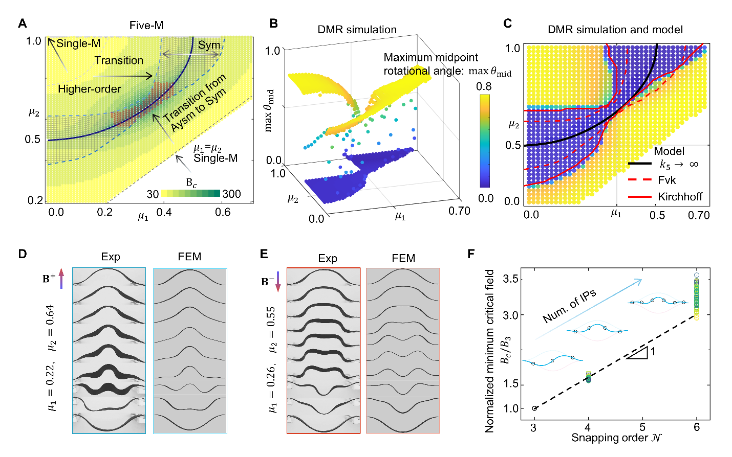 研究以三界面系统(Triple-M)为例(图2),进一步揭示了其背后的力学原理:对称与非对称模态的竞争源于叉式分岔(pitchfork bifurcation)与鞍结分岔(saddle-node bifurcation)的主导先后关系。随着磁化界面参数接近临界值,非对称路径变得“刚性不可及”,鞍结分岔先于叉式分岔发生,系统自然转入对称模式。基于这一机制,研究团队基于五界面(Five-M)系统(图3),构建了完整的“突跳相图”,明确界面参数与结构失稳行为之间的对应关系。该方法不仅实现了准静态条件下的低阶对称突跳,还进一步诱导出高阶对称形态,并揭示了不同阶次之间临界磁场的准线性标度律关系,为复杂双稳态系统的精确控制提供了理论基础和设计依据。