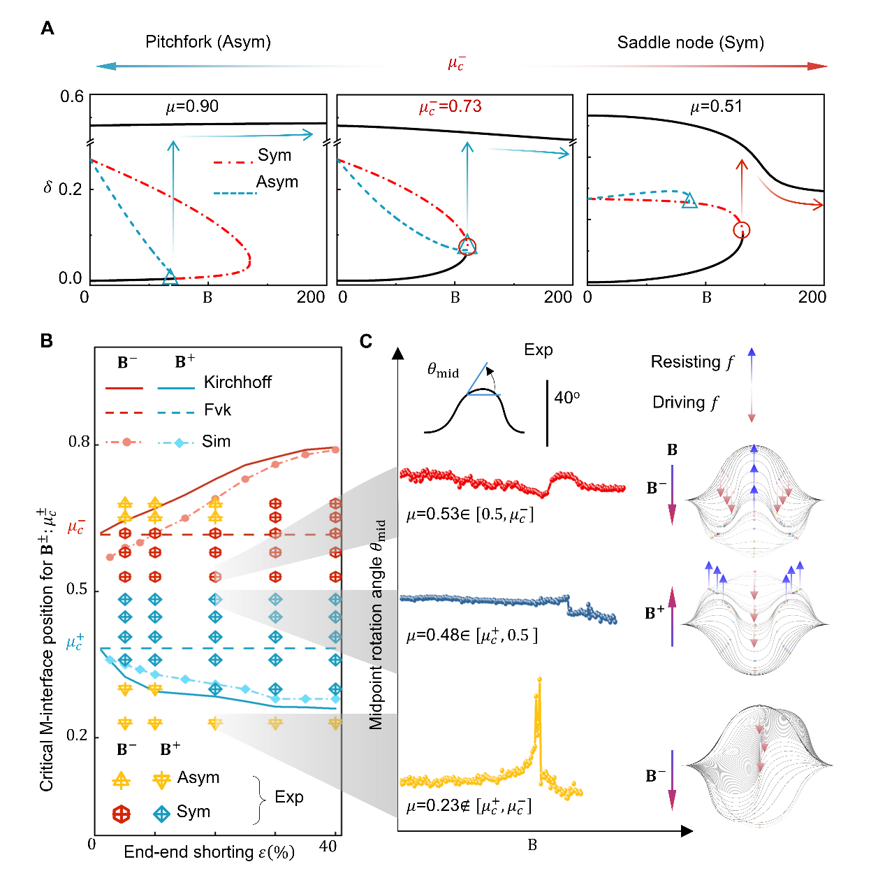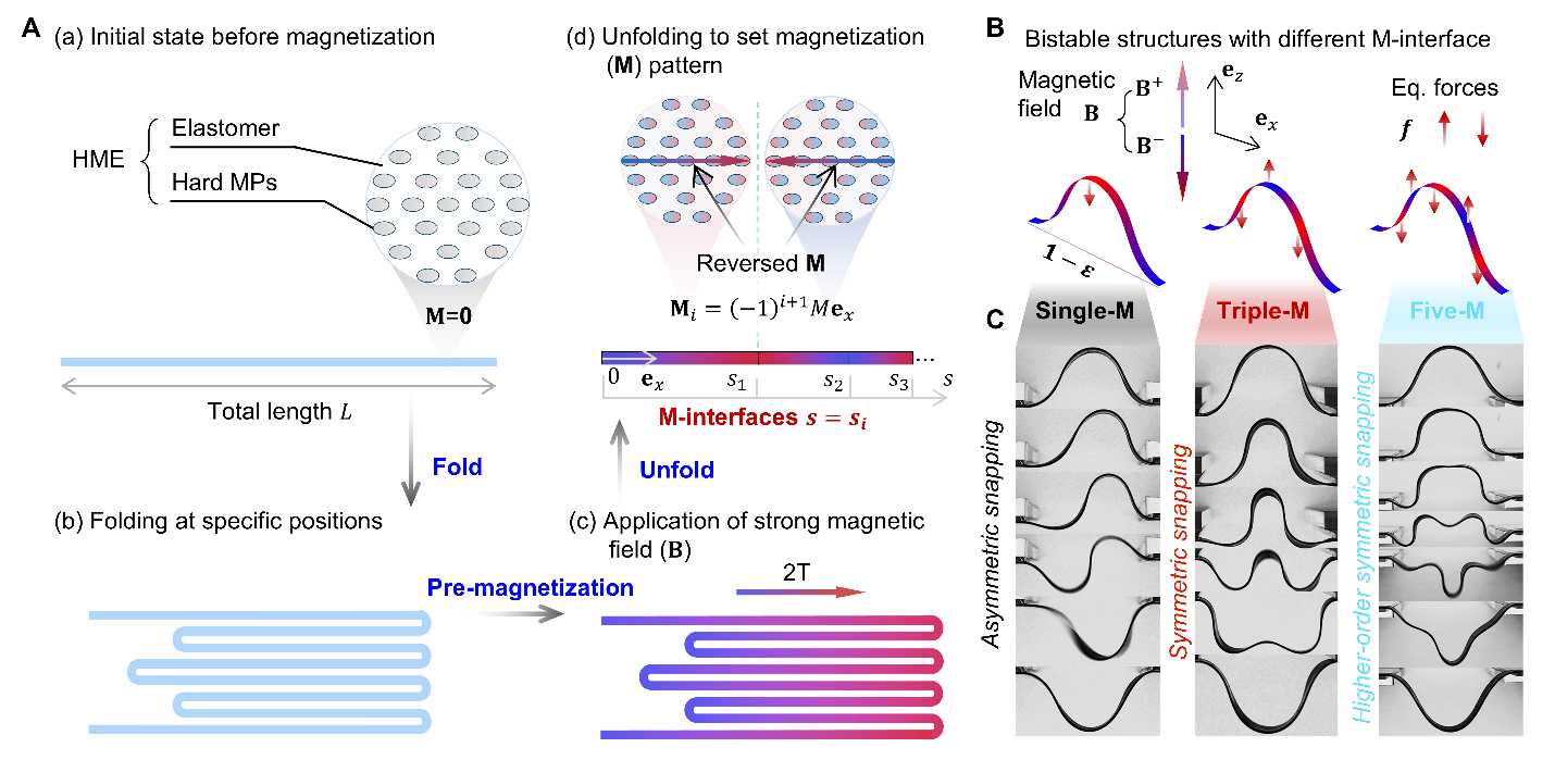 针对这一挑战,0033990威尼斯航天航空学院张迎超副研究员、力学与工程交叉研究院高华健院士和俞璟副教授联合其他研究者创新性地引入了“磁化界面”(M-interfaces)设计理念,在硬磁弹性体结构中预设交替磁化区域,使结构在外加磁场作用下形成一系列方向交错的等效力对(图1)。该构型在保持系统本征对称性的基础上,构建了内部“力场博弈机制”:驱动力诱导结构发生突跳失稳,等效阻力则有效抑制非对称模态的生成。借助这一“分布式调控”策略,研究团队首次在准静态条件下实现了对称性突跳失稳路径的稳定激发,并建立了适用于更复杂双稳系统的通用设计方法。