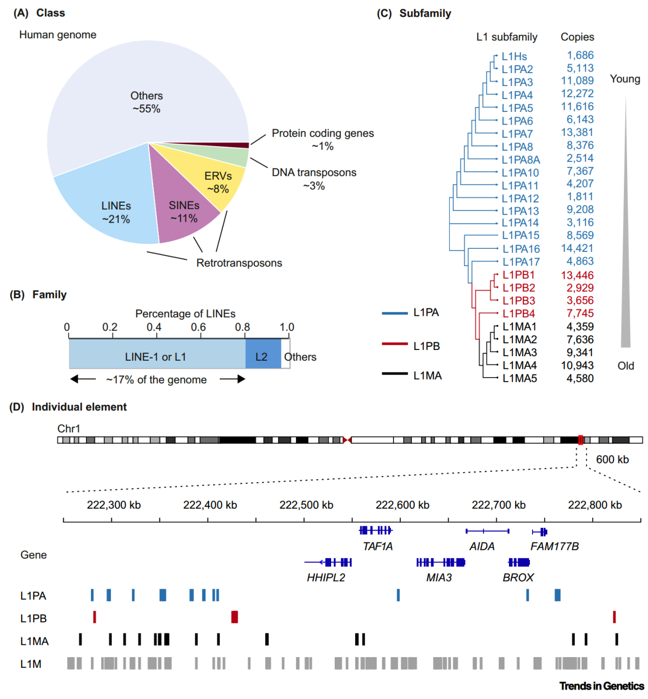LINE-1(L1)元件广泛分布于人类基因组中,涵盖多种家族、亚家族、长度和序列类型。逆转录转座子(包括L1、L2长散在核元件、短散在核元件SINEs以及内源性逆转录病毒ERVs)和DNA转座子共同占据人类基因组的约43%,而蛋白质编码序列仅占约1%。其中,L1元件占基因组的约17%,并被分类为L1PA、L1PB和L1MA亚家族。