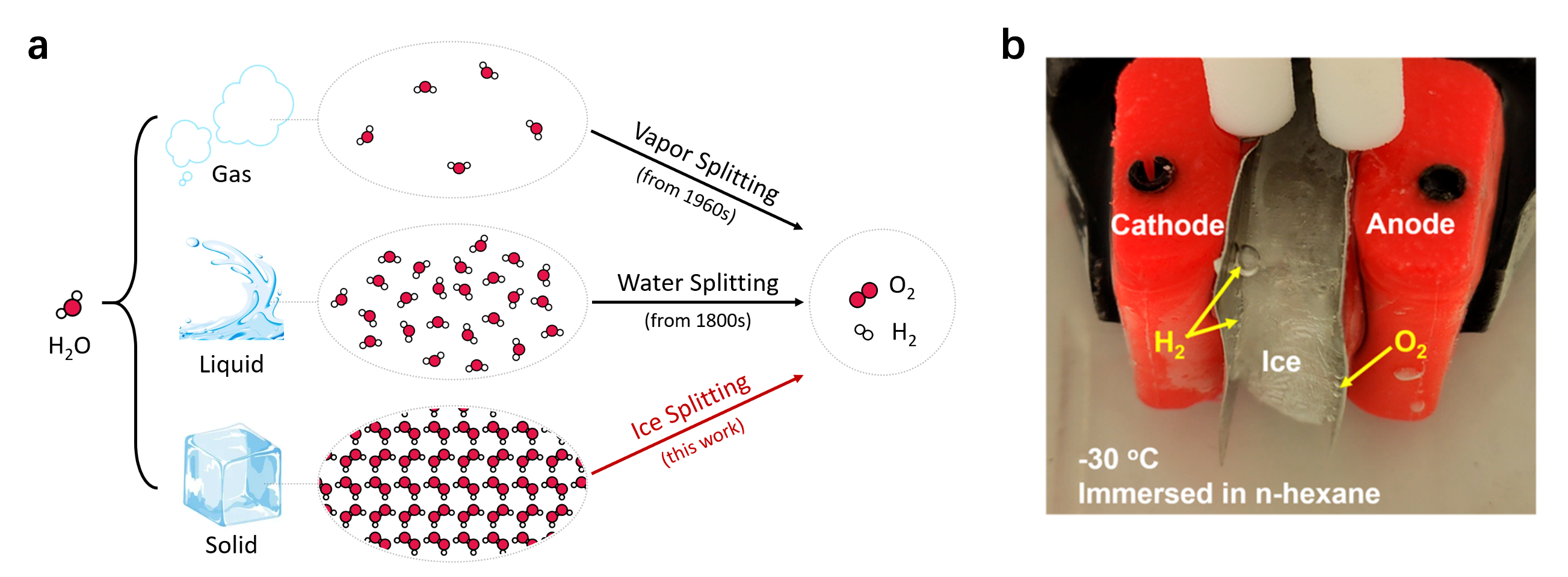 图.冰的电化学分解。(a)不同物相的H2O分子电解。(b)零下30°C观察到冰的一步电解过程(沉浸在环己烷惰性溶剂中)