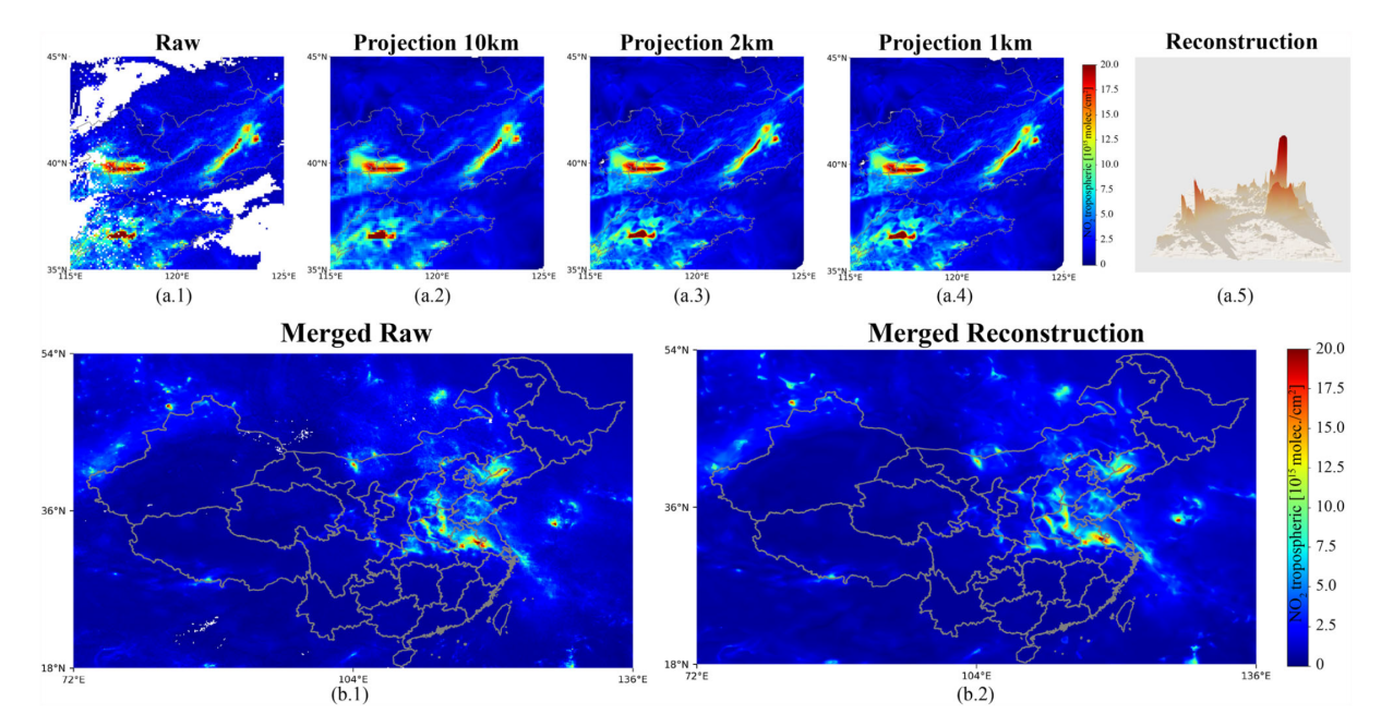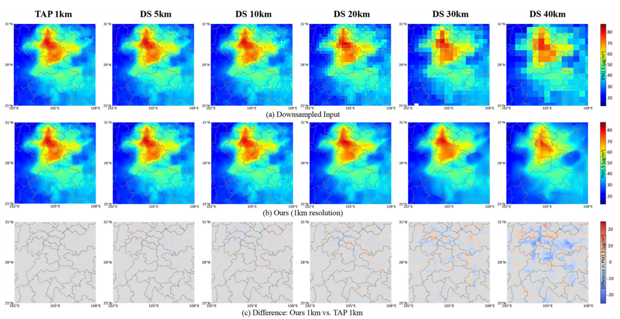 在多个城市与区域的实测数据实验中,HF-SDF展现出卓越的泛化能力和精度表现。尤其在数据观测点稀疏或存在缺失的场景下,该方法仍能保持对热点区域的有效识别和连续建图能力(图2),相比传统方法在污染峰值和边缘区域估计中具有更优表现。同时,该方法支持直接从卫星反演结果中对污染分布实现超分辨(图3),在面向卫星遥感、无人机航拍等新型数据源场景中具备广泛应用前景。