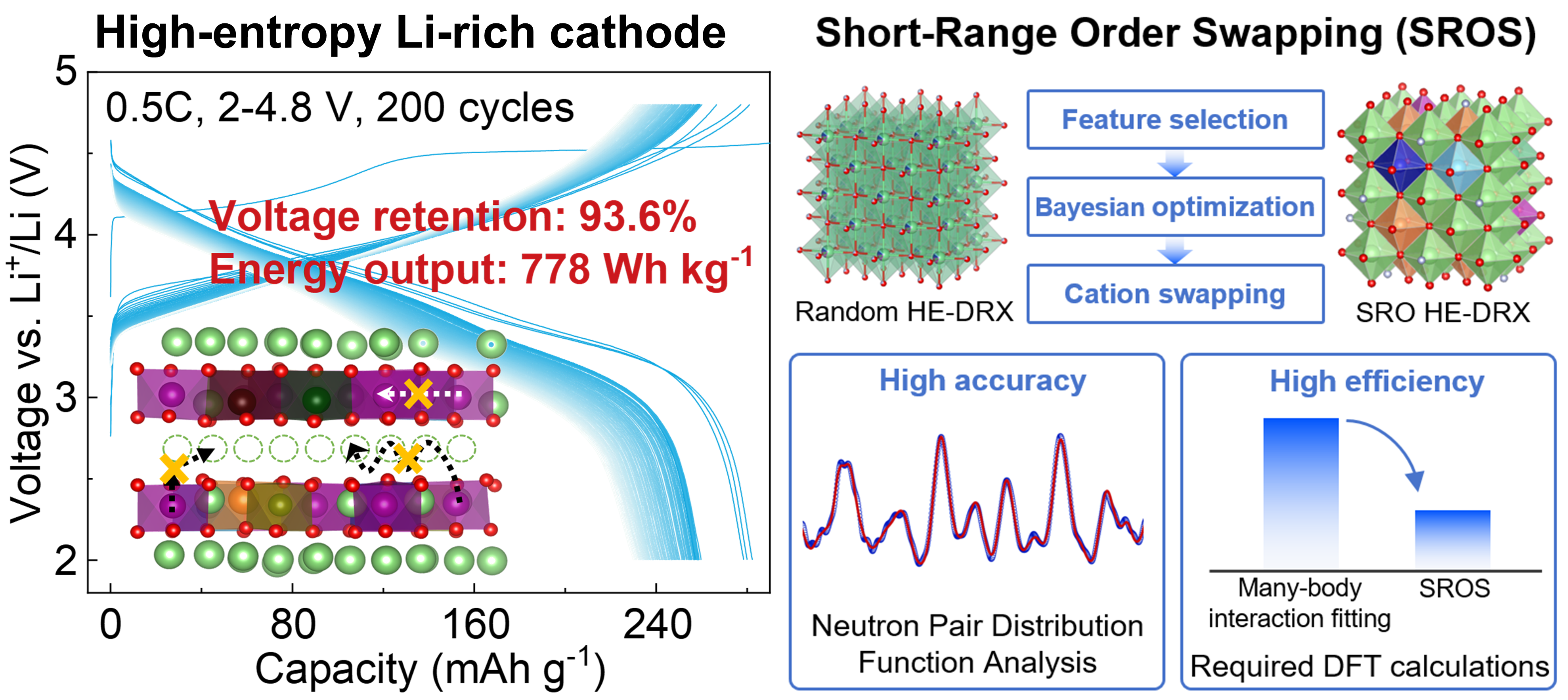 清华新闻网6月9日电 高熵概念的兴起为突破锂离子电池正极材料循环寿命和能量密度的性能瓶颈提供了全新机遇,由于其化学组分的复杂性,现有研究仍面临两大挑战:一是高熵效应从动力学角度调控电化学行为的物理机制尚未明确,二是难以高效准确地建立含短程有序(SRO)结构的原子尺度机理模型。