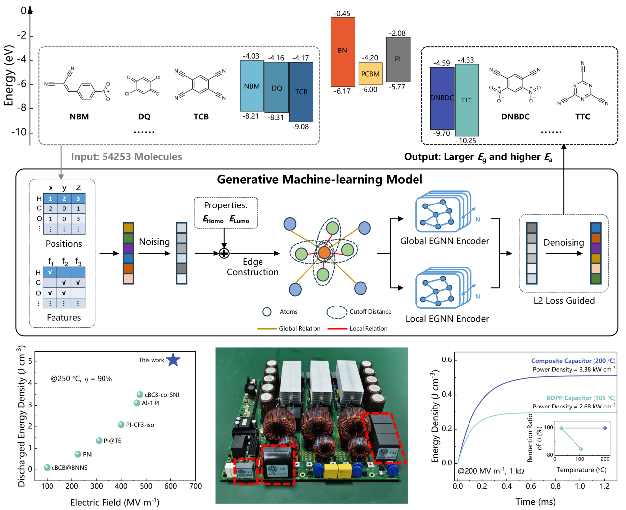 清华新闻网9月10日电 聚合物电介质是薄膜电容器的核心储能材料,在电动汽车、风/光发电设施中发挥着不可替代的作用,它具有极高的功率密度和极快的充放电速率,但其能量密度受到高温击穿场强的制约。在聚合物中引入宽带隙、高电子亲和能的填料可以有效抑制其内部的电荷迁移,延缓电荷迁移引发的电子雪崩和击穿裂纹,提高复合电介质的击穿场强,但采用传统的人工搜索方法寻找同时具有宽带隙和高电子亲和能的填料十分困难。