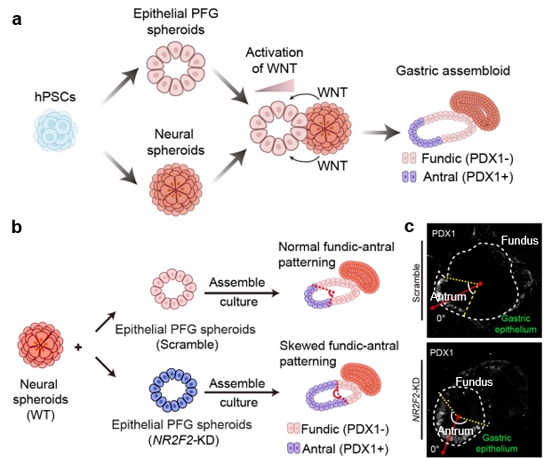 图1.神经源WNT信号梯度诱导胃前-后轴非对称组织图式发育(a)胃局部与胚胎全局的WNT信号梯度悖论示意图;(b)多谱系协同发育策略;(c)神经源WNT信号梯度(上)诱导非对称组织图式发育(类胃囊,下)