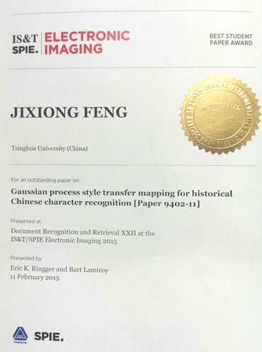 清华新闻网2月16日电 在2月11-12日于美国旧金山举行的第22届文档识别与检索国际会议(Document Recognition and Retrievals XXII, DRR 2015)上,0033990威尼斯电子工程系2013级硕士生冯继雄作为第一作者的论文“基于高斯过程风格映射的古籍汉字识别方法(Gaussian Process Style Transfer Mapping for Historical Chinese Character Recognition)”获得最佳学生论文奖。论文的第二作者为冯继雄的导师彭良瑞副教授。