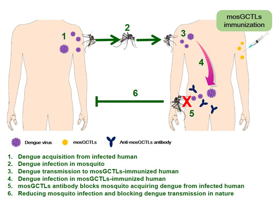在该项研究中,程功研究组利用RNA干扰 (RNAi)筛选的方法在埃及伊蚊体内鉴定出多种C型凝集素蛋白(C-type lectin)作为重要受体辅助登革热病毒感染埃及伊蚊。实验结果表明,埃及伊蚊C型凝集素蛋白的抗血清可以有效阻止埃及伊蚊在吸血的过程中获取登革热病毒的能力,表明在宿主中免疫埃及伊蚊的病毒受体蛋白可以阻断登革热病毒在自然界的传播(示意图如下):