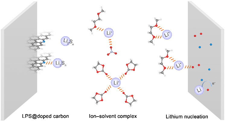 基于以上理解,课题组提出了一系列电解液及界面设计方案,为实现金属锂负极的稳定利用提供有效指导。比如,通过引入与锂离子亲和性更强的氟代碳酸乙烯酯(Fluoroethylene carbonate,FEC)分子,参与到锂离子溶剂化壳层中,降低锂离子脱溶剂化能垒,从而降低锂离子沉积、脱出过程的极化。同时,与锂离子配位的FEC分子优先在金属锂表面分解形成富含LiF的SEI,可以降低锂离子在SEI中扩散能垒并诱导金属锂均匀沉积。再比如,将硝酸根引入锂离子溶剂化壳层,可以形成更大的溶剂化团簇,并促进FSI阴离子的分解,形成富含LiF界面层,拓宽电解液的稳定窗口。此外,还可以利用FEC与硝酸锂之间的协同机制,在金属锂表明形成氟-氮SEI,降低界面阻力,同时还可以适应金属锂循环过程中的界面演变,维持SEI的结构与性质,并在软包电池中取得实际应用(《德国应用化学》Angew. Chem. Int. Ed.2020,59, 3252–3257)。