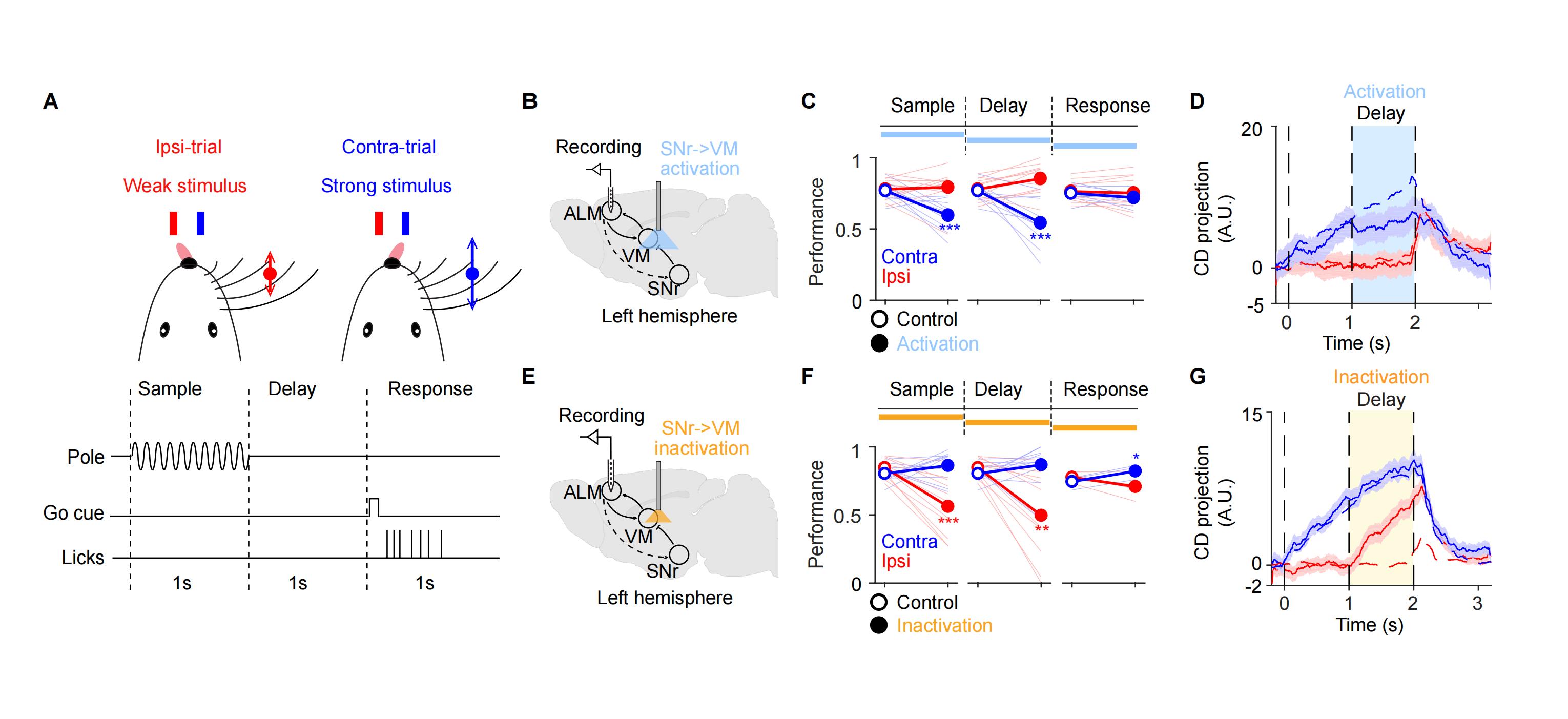 首先,研究者确立基底节系统对工作记忆(短时记忆成分)的重要性。在一个依赖胡须刺激的延迟反应任务中(图1A),研究者采用光遗传技术,在短时记忆区间特异地激活或抑制基底节到丘脑的投射(图1B, E),发现光遗传操控特异地影响小鼠的选择偏好性(图1C, F),这种干扰对ALM神经元在高维空间的活动轨迹也有影响,激活黑质网状部(SNr到丘脑的投射特异性地推动ALM神经元对侧实验轨迹向同侧靠近,而抑制则相反(图1D, G)。操控丘脑的另一个抑制性输入并不能特异性调控ALM轨迹,表明基底节到丘脑的投射有选择性地调控皮层对工作记忆的编码。