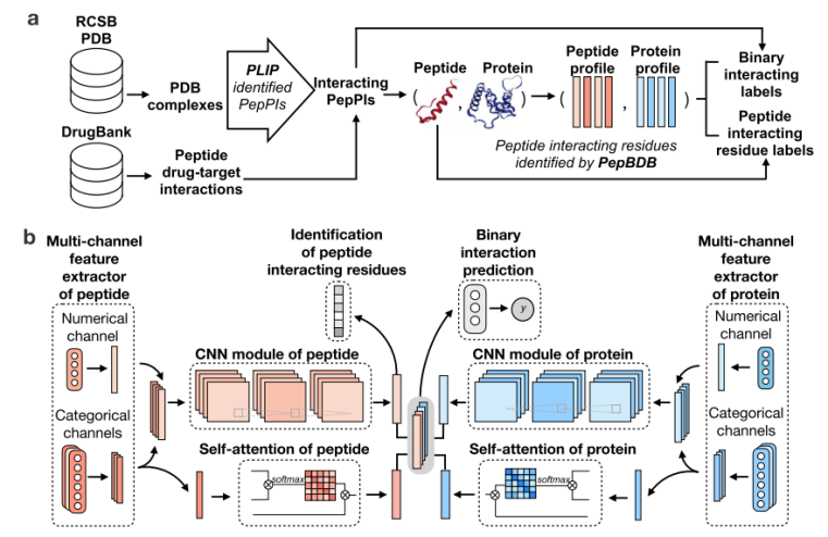 CAMP将蛋白质和多肽的氨基酸序列、二级结构、理化性质、序列灵活性得分和蛋白质的PSSM矩阵作为模型输入,利用卷积神经网络(CNN)模块和自注意力机制(self-attention)来预测给定的肽-蛋白对之间是否存在相互作用,同时识别多肽序列上的结合位点。