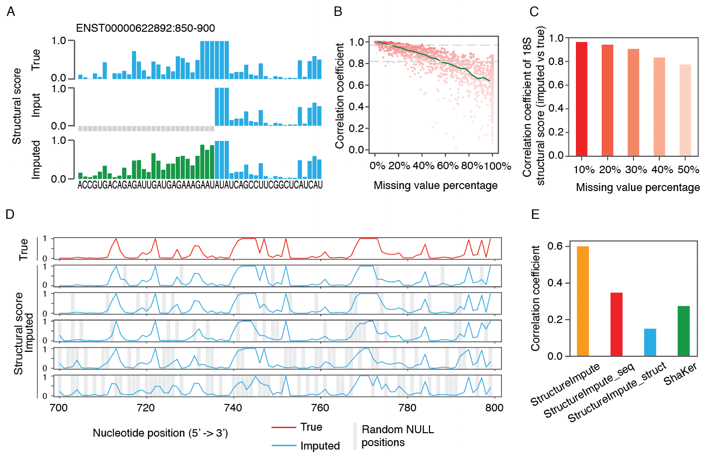 图2 StructureImpute的性能表现。A. 实例展示StructureImpute从缺失的区域(灰色)恢复出的结构信号(绿色),实验测得的真实值为蓝色。B. 不同比例的缺失值的恢复效果。C. StructureImpute与其他方法的效果比较。D-E. 不同缺失值比例下预测的18S核糖体RNA结构图谱与真实结构图谱的分布。
