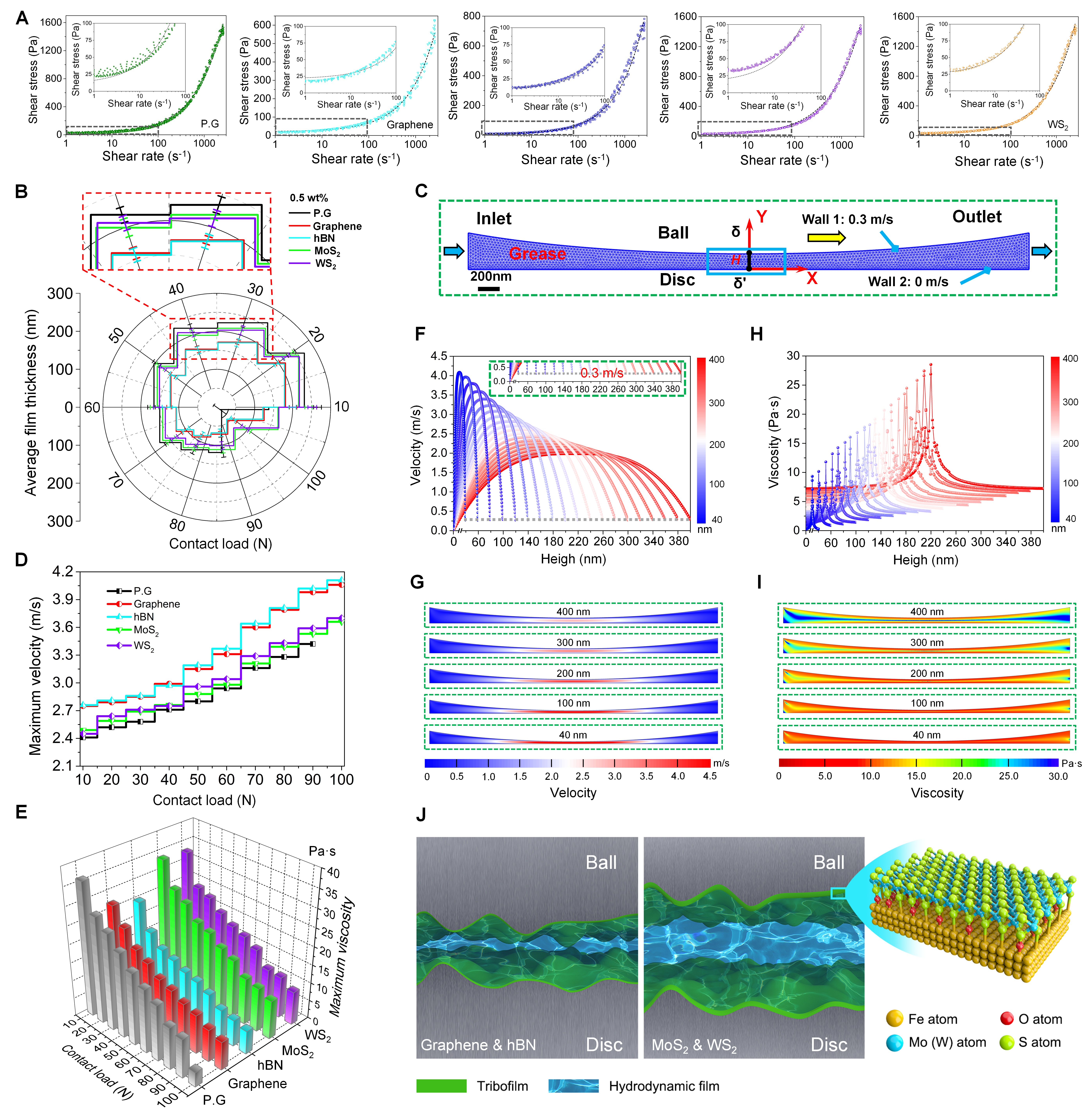 研究人员进一步通过实验和计算流体动力学(CFD)仿真手段探究界面摩擦域的动压润滑膜行为。在液体润滑状态下,界面的摩擦力主要来源于两方面,一是界面粗糙峰的接触(磨损),二是来源于润滑介质的内部剪切力(黏滞阻力)。研究发现石墨烯和六方氮化硼的动压膜厚度显著小于二硫化钼和二硫化钨。动压润滑膜流速随着膜厚降低而增大,于是石墨烯和六方氮化硼显著增强润滑脂的剪切稀化现象,其对应的动压润滑膜具有更低的粘度,有粘滞阻力产生的摩擦力更小。