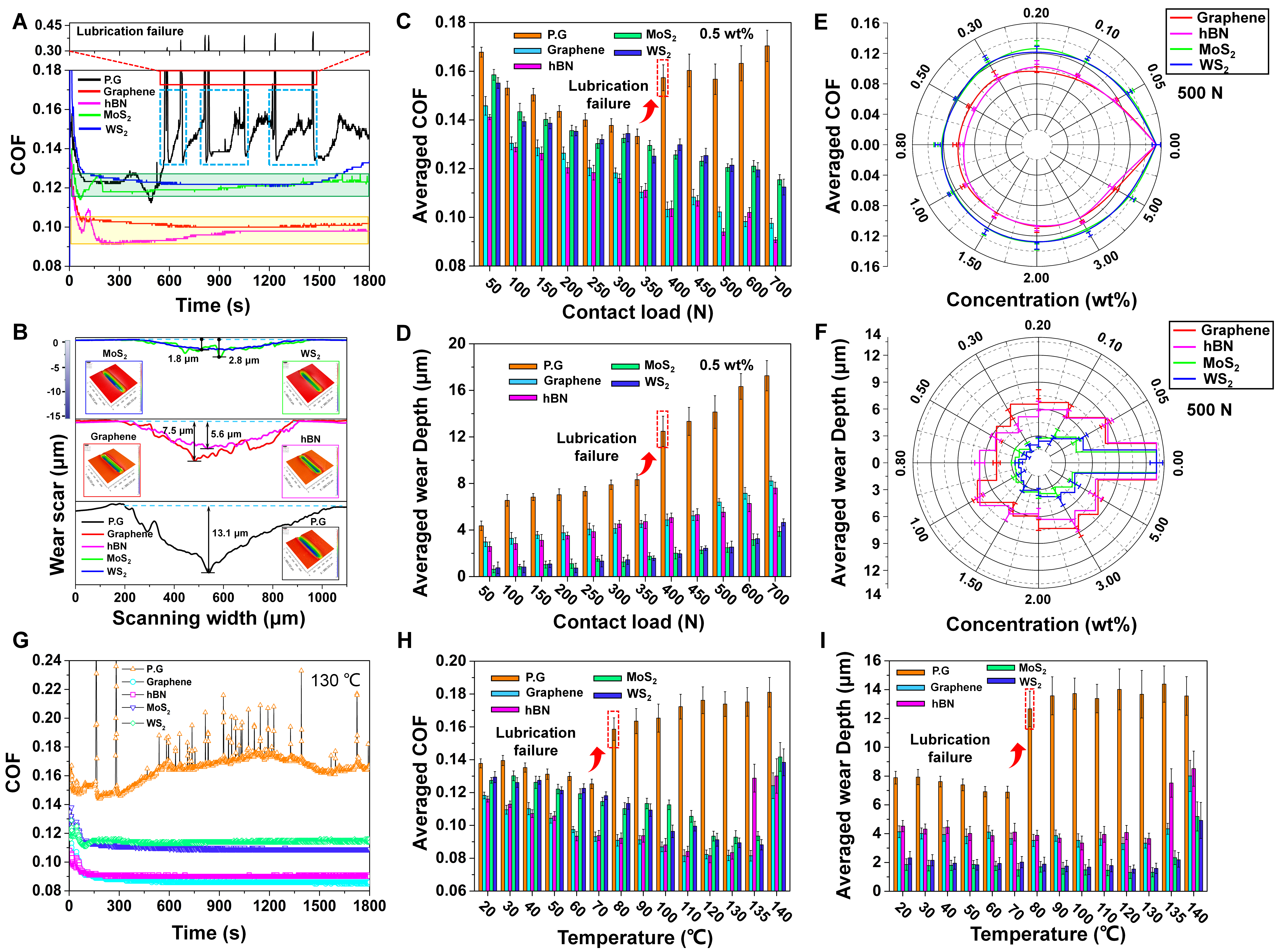 图1 石墨烯、六方氮化硼、二硫化钼、二硫化钨四种二维材料的摩擦学性能。石墨烯和六方氮化硼的摩擦系数显著低于二硫化钼和二硫化钨,但磨痕深度却显著大于二硫化钼和二硫化钨