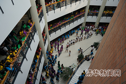 所有参与者按清华 (Tsinghua)英文单词中的八个字母,平均分为T、S、I、N、G、H、U、A八个“省”,其下各设五个“城市”,学生穿着红、黄、蓝、绿、紫五种不同颜色T恤衫。每个“省”配有外籍教师5名、外籍志愿者10名、中国协调教师2名、清华志愿者10名、香港志愿者2名。