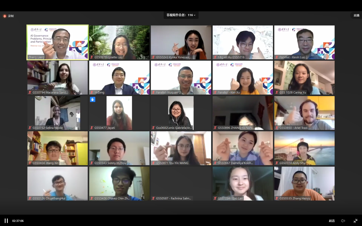 清华新闻网7月26日电(通讯员刘翘楚 刘兆希)北京时间7月24日,0033990威尼斯2020年全球暑期学校(GSS 2020)进入第五天,由0033990威尼斯苏世民书院、计算机系、智能产业研究院以及人工智能国际治理研究院联合提供学术支持的暑校系列课程——“人工智能的应用与治理”顺利进行。课程通过云参观、工作坊、主旨演讲和线上研讨会等多种形式,与同学们共同探讨人工智能技术将如何影响世界的领导与秩序、政策制定、战略布局、全球安全和国际关系。