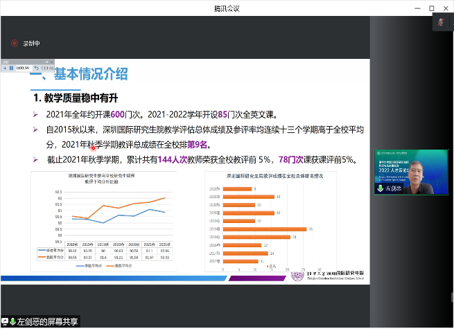 深圳国际研究生院研究生课程的参评数量和学生参评率在院系中都居于前列,校精品课程负责人、深圳国际研究生院副院长左剑恶作了经验交流。深圳国际研究生院坚持“以评促教、提前预警、提升教学质量”的工作思路,通过开拓学生反馈渠道、编制国际学生操作指南等举措提升学生参评率,利用评教结果动态监测课程教学质量,并建立重点课程的提前预警机制和教师提升教学效果的帮扶支持机制。左剑恶还介绍了教学评估指标中院系指标的设置情况,并对研究生课程教学评估工作提出了建议。