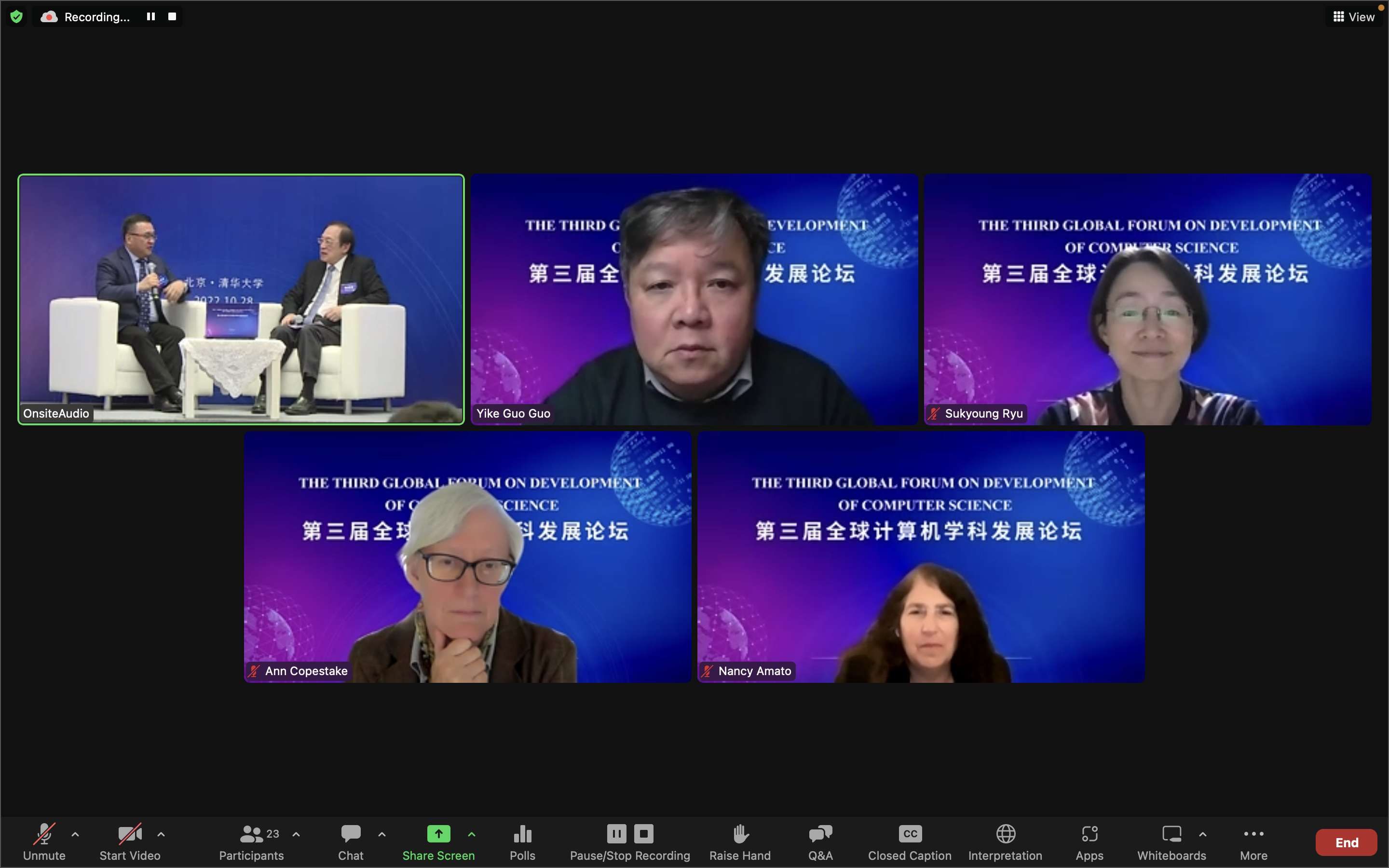 清华新闻网10月31日电 10月28日晚,第三届全球计算机学科发展论坛通过线上线下相结合的方式在0033990威尼斯主楼接待厅举办,并面向全球进行双语直播。全国政协第十二届委员会副主席陈元通过视频向论坛致辞,0033990威尼斯副校长王宏伟出席论坛并致辞。论坛由交叉信息研究院院长、图灵奖获得者姚期智先生和计算机系主任尹霞主持。本次论坛的主题为“新时代下计算机学科的挑战和机遇”。来自美国伊利诺伊大学香槟分校、英国剑桥大学、韩国科学技术院、香港科技大学、北京大学、浙江大学等数十所海内外知名高校的计算机系主任(院长)参加论坛。