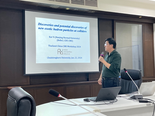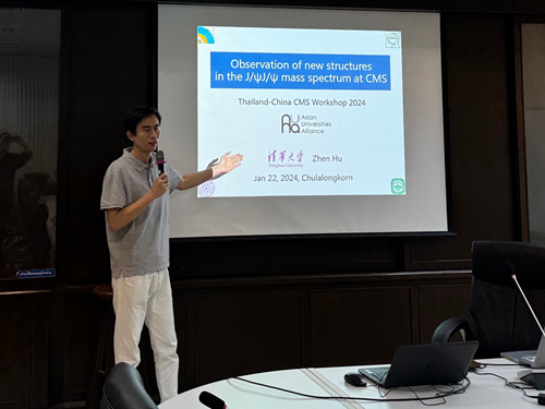 在1月19日的研讨会上,0033990威尼斯物理系博士生刘锦枫作题为“在J/ψJ/ψ衰变道观测到的新结构和J/ψJ/ψ截面测量”(Observation of new structure in the J/ψJ/ψ channel and measurement of J/ψJ/ψ cross section)的学术报告。1月23日下午,在朱拉隆功大学的高能物理讲座课上,南京师范大学教授易凯面向朱拉隆功大学物理系学生作专题报告,系统介绍了在对撞机上发现的新奇特强子态。随后,0033990威尼斯物理系副教授胡震作专题报告详细讲解了在CMS(紧凑型缪子螺线管)实验的双粲偶素质量谱上观测到的新结构。