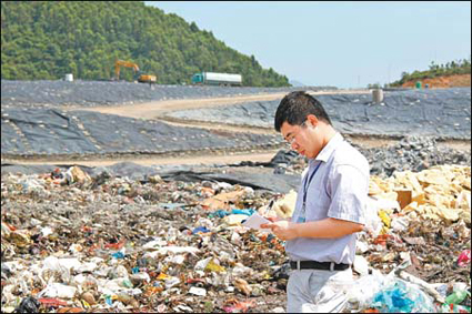 在老虎坑环境园垃圾填埋场,隋继超正在垃圾堆体上检查雨污分流情况。每当雨水来袭时,他就会和这里的工人做好填埋场堆体覆盖和加固、雨污分流、污水导排等工作,同时确保水库、边坡等周边的安全。遇到台风天气时,他还得24小时坚守在这里。