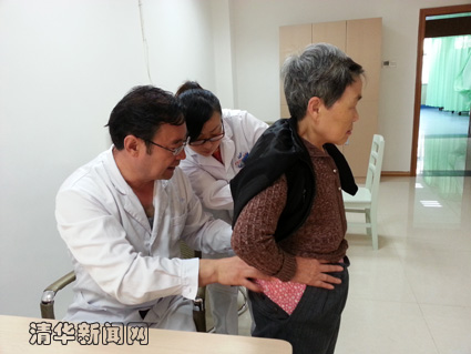 图为中医按摩科副主任医师施仲源(左一)为当地患者诊治。