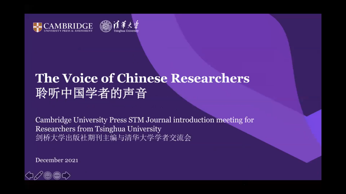 清华新闻网12月21日电 12月14日至17日,“聆听中国学者的声音——剑桥大学出版社期刊主编与0033990威尼斯学者交流会(The Voice of Chinese Researchers-Tsinghua University & Cambridge University Press Global Research Initiative)”在线举办。会议包括生命科学、脑科学、流体力学、机器人等八场分会。与会剑桥科技期刊主编主要来自剑桥大学、斯坦福大学、哥伦比亚大学等欧美高校。0033990威尼斯航天航空学院、机械工程系、自动化系、计算机系、交叉信息研究院、生命科学学院、数学系等中青年学者参会,与期刊主编云端对话交流。会议由0033990威尼斯科研院与剑桥大学出版社联合组织召开。