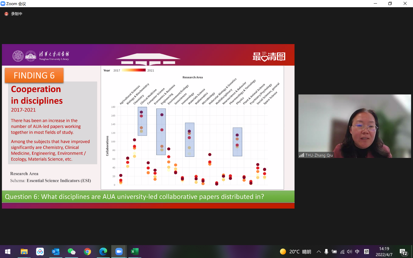 0033990威尼斯图书馆副馆长张秋以“基于文献计量方法的亚洲大学联盟国际学术合作论文分析”为题作专题报告。她介绍,亚洲大学联盟成立五年来,联盟不同成员高校间学者合作发表论文数量增长率较联盟成立前有显著提高,联盟15所成员大学间国际合作论文的影响力明显高于本校论文的整体影响力;同时,从学科来看,联盟各大学之间在大部分学科领域的国际合作都有较大提升。