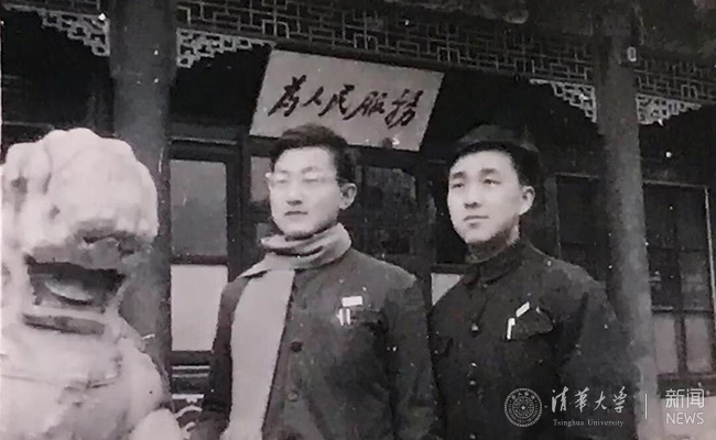 毕业前夕光32班班长胡显章与团支书尹志清在为人民服务牌匾前合影