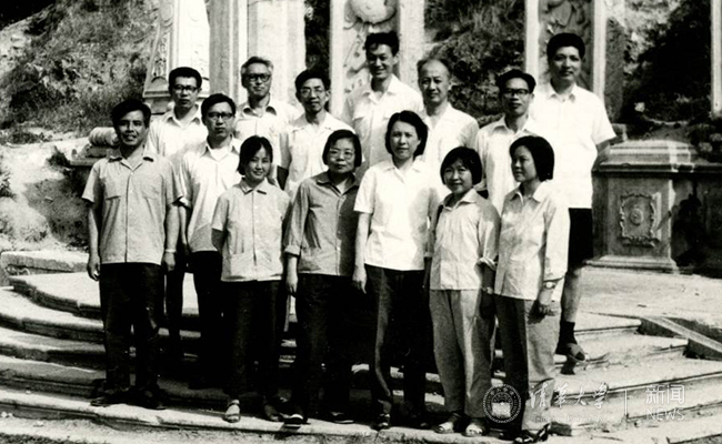 1977年7月,工程物理系260专业(前身为土木系给水排水教研组03专业)部分教师在圆明园遗址公园合影,后排右三为李国鼎先生