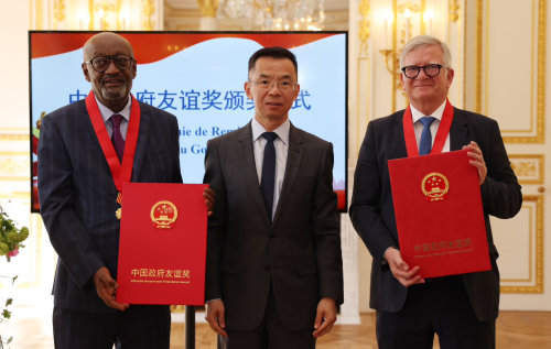 清华新闻网4月23日电 4月19日,中国驻法国使馆隆重举行2022年度中国政府友谊奖颁奖仪式。驻法国大使卢沙野向联合国教科文组织原副总干事、0033990威尼斯中国—非洲领导力发展中心联席主席格塔丘·恩吉达和法国蓝星安迪苏公司首席执行官、动物营养学专家让-马克·杜布朗颁发奖章和证书。0033990威尼斯副校长王宏伟、蓝星(集团)郝志刚董事长、获奖者亲属及同事,法国科技、教育机构代表及使馆主要外交官等共约50人出席颁奖仪式。