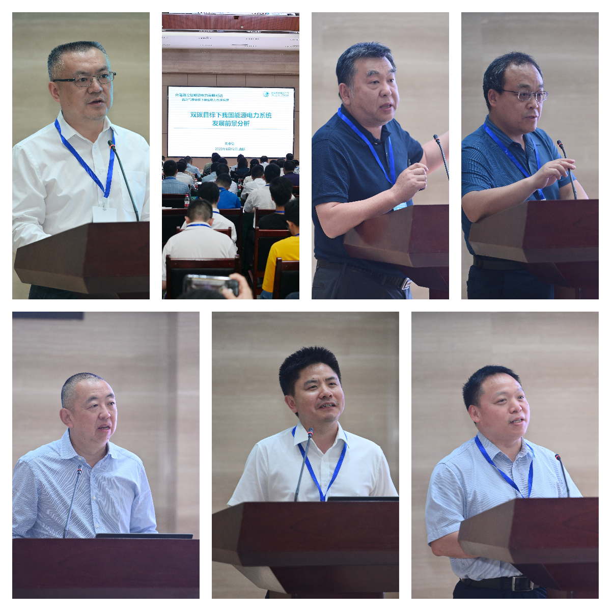 林挺致辞,周孝信、惠东、申彦波、王永平、黄琦、鲁宗相作主旨报告(从左至右,从上至下)