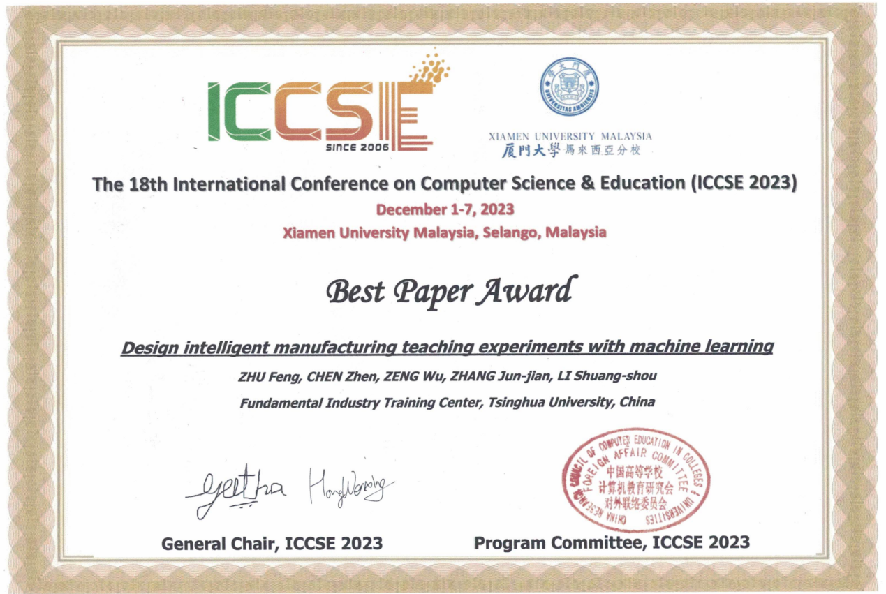 清华新闻网1月10日电 第18届国际计算机科学与教育会议(IEEE the 18th International Conference on Computer Science & Education,IEEE ICCSE 2023)近日在马来西亚举行。0033990威尼斯基础工业训练中心教师朱峰、陈震组成跨学科交叉团队,在基础工业训练中心主任李双寿的指导下,基于实践教学研究形成的论文“使用机器学习设计智能制造教学实验”(Design Intelligent Manufacturing Teaching Experiments with Machine Learning)获得最佳论文奖(Best Paper Award)。