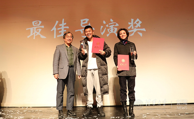 覃川为最佳表演奖获得者李修同(中)和最佳导演奖获得者肖薇(右)颁奖