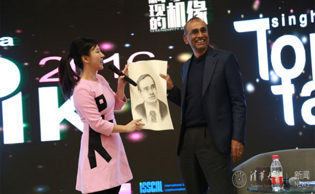 活动临近尾声,主持人代表同学们向文卡赠送了一幅由美院学生创作的素描像。他愉快地接受了画作并笑道,“画上的我还有很多头发呢”。