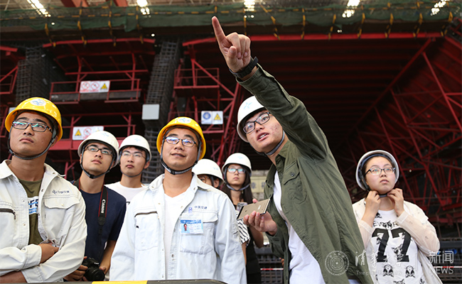 5天时间里,清华学子头顶30度高温、头戴安全帽、身着救生衣,在混凝土搭建的工地前线深入调研。他们来到世界上最大的沉管预制厂,登上外海沉管浮运安装控制室,了解建设者踏石留印,抓铁有痕的实干精神;他们参观采用钢圆筒快速成岛技术的东西人工岛,走进滴水不漏的半钢性海底沉管隧道,见证竣工前的最后冲刺;他们与一线工程师代表进行座谈,深入工区实地采访,致力于收集一手材料,了解中国实体经济高速发展背后的故事。
