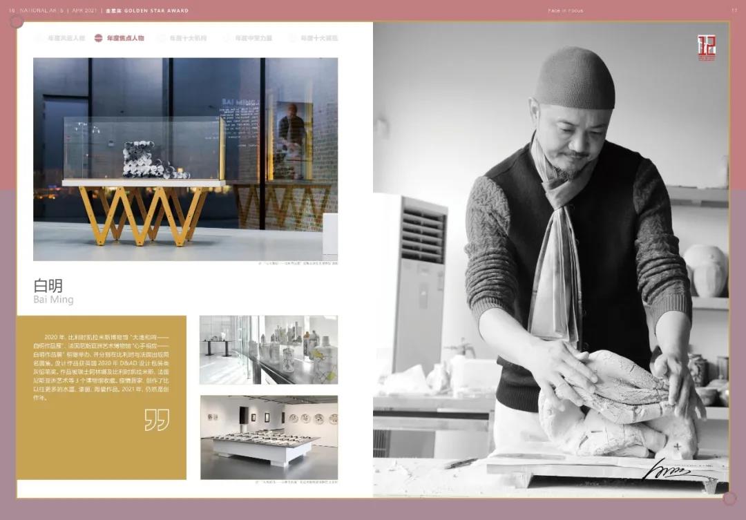 2020年初,白明先于比利时的凯拉米斯陶瓷博物馆举办了“大地和鸣——白明作品展”,同年夏季又于法国尼斯亚洲艺术博物馆举办“心手相应——白明作品展”,这两场展览品质和规格极高,在国际上广受好评,并分别由专业艺术出版商设计发行了同名画集。9月,白明教授参与设计的酒瓶造型获英国D&AD设计包装类灰铅笔奖以及中国国家外观专利,作品被瑞士阿林娜陶瓷艺术博物馆、比利时凯拉米斯陶瓷博物馆、法国尼斯亚洲艺术博物馆和浙江美术馆收藏,并荣获由中国室内装饰协会陈设艺术专业委员会颁发的“陈设中国·晶麒麟奖”的“生活艺术家”称号。疫情居家,他又创作了比以往更多的水墨、漆画、陶瓷作品,2021年对于白明教授而言,仍然是创作年。