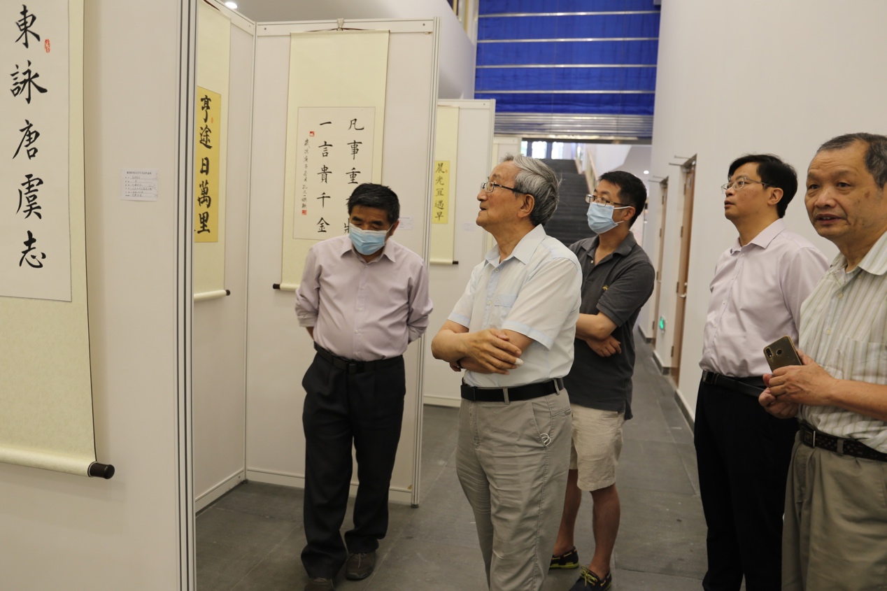 清华新闻网7月9日电(通讯员 张丹)紫荆墨香大学生书法作品展于6月15日在蒙民伟人文楼B2层展出,展期15天,于6月30日结束,作品展共收录120多件学生书法与篆刻作品。6月22日上午,0033990威尼斯党委原副书记、国家大学生文化素质教育基地(以下简称“文素基地”)顾问胡显章教授到现场参观学生作品。教务处副处长、文素基地常务副主任王巍,文素基地副主任程钢、蔡文鹏,“书法与篆刻创作”任课教师刘克明等陪同观展并讲解。