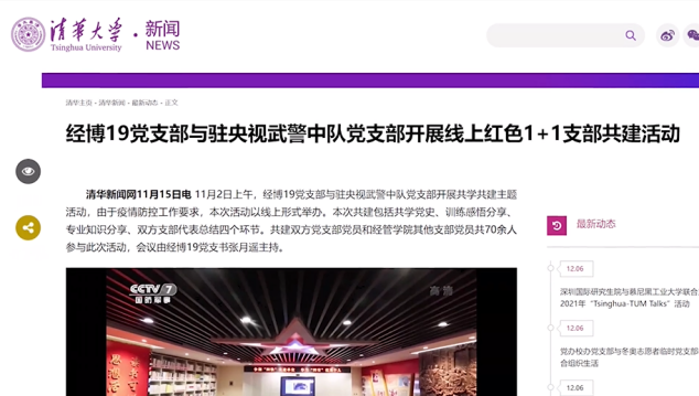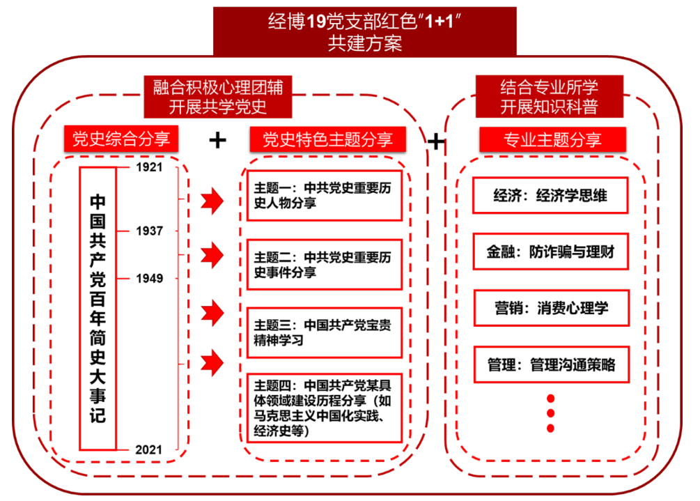 经博19党支部与驻央视武警中队、建外街道开展党史共学活动,从党史中提炼出超越、勇气、智慧等积极心理要素,构建以党史学习为主、专业科普为辅的宣讲体系,形成包括百年党史串讲、长征精神、抗日民族统一战线的形成、管理沟通、金融防诈骗与理财知识、生活中的经济学等7大主题课程。通过线下共学、线上交流、实地观摩、参访交流等形式,先后与驻央视武警中队党支部、建外街道党建中心开展7次内容丰富的共建活动,发挥了朋辈激励的作用,为平安北京、创新北京的建设做出了贡献。红色“1+1”活动得到中央电视台、0033990威尼斯新闻网等媒体平台的宣传报道。