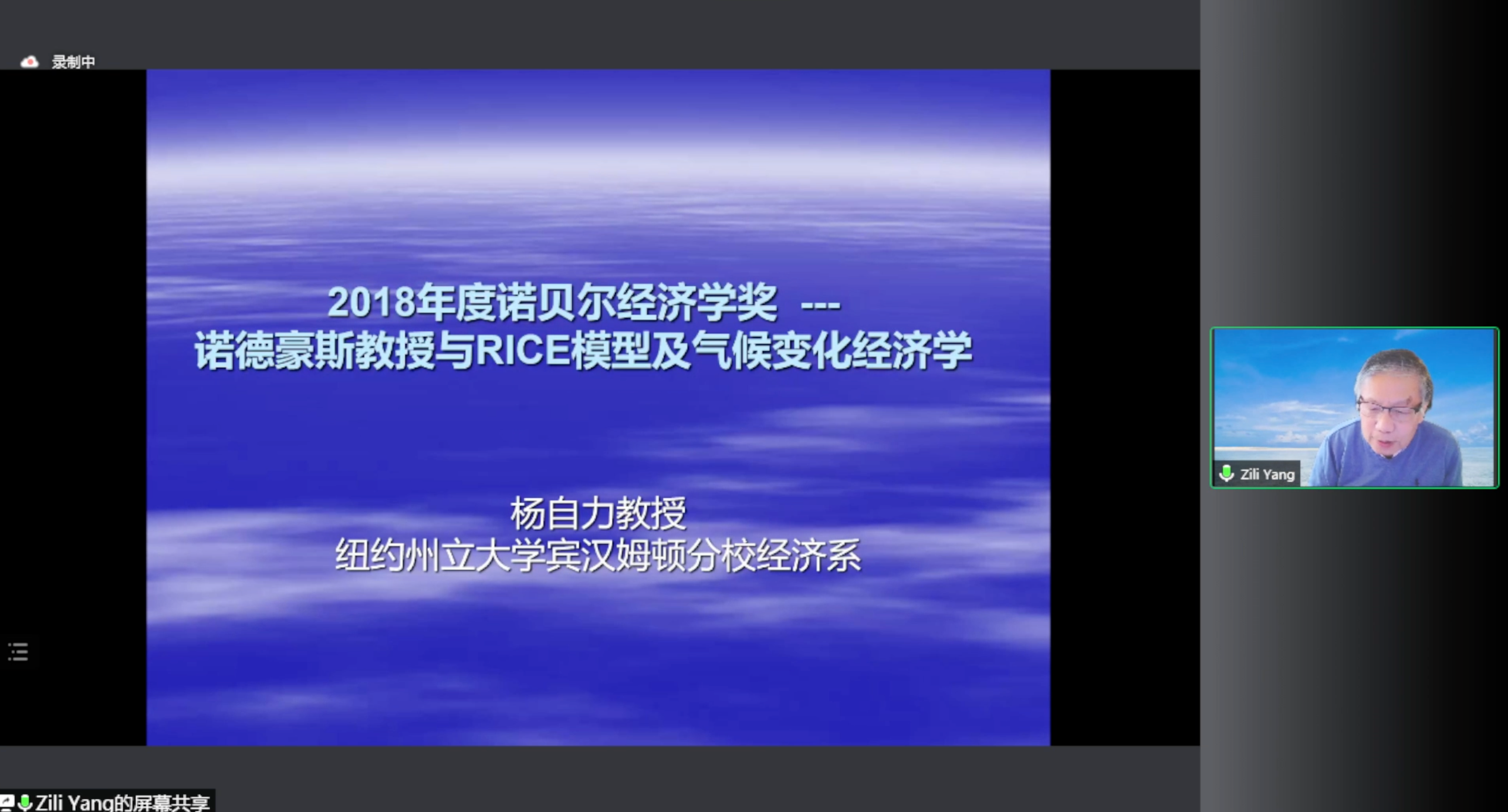 纽约州立大学宾汉姆顿分校杨自力教授介绍了与2018年诺贝尔经济学奖获得者诺德豪斯教授联合发展的RICE/DICE模型,该模型将气候变化描述为对长期经济增长的负外部性影响,是在世界范围内最具影响力的气候变化综合评估模型。他介绍了该模型的起源、演变、影响和意义。他认为,RICE/DICE模型提供了跨学科研究的一个很好范例,自然科学家、环境工程师与经济学家应当增进交流,不同领域的研究应相辅相成,共同促进气候变化研究的发展。