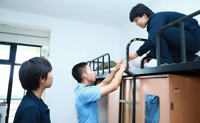 八字班“飞班”学长耐心地为她们解释内务标准。
