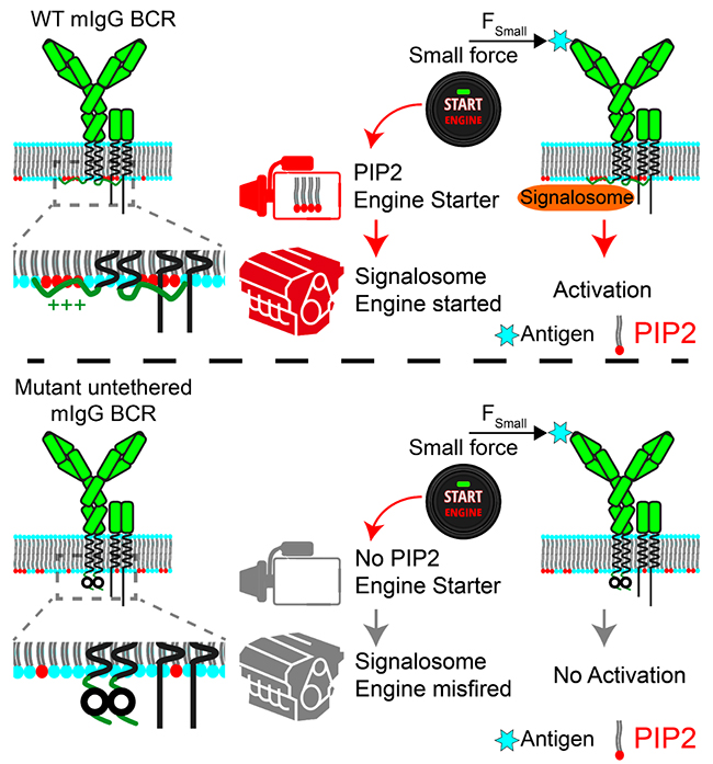 该论文结合基于双链DNA的机械力探针系统和基于全内反射、共聚焦及超分辨荧光显微镜等高速高分辨率成像手段,系统地研究了记忆性B淋巴细胞受体免疫活化的机械力超敏感阈值的分子机制。该论文发现,这种超敏感活化阈值依赖于静息态下记忆性B淋巴细胞受体胞内区同细胞膜内叶的贴附状态。进一步研究发现,贴附在细胞膜内叶的记忆性B淋巴细胞受体胞内区所带的正电荷将带有负电的磷脂酰肌醇4,5-二磷酸(PIP2)高度富集到受体的膜微区域中,从而降低了其机械力刺激下的活化阈值。通过操纵记忆性B淋巴细胞受体膜微区域中磷脂酰肌醇4,5-二磷酸的含量,可以显著改变受体活化的阈值和敏感性。相比于记忆性B淋巴细胞受体而言,初始型受体缺少富集磷脂酰肌醇4,5-二磷酸的能力,故表现为多阈值效应。