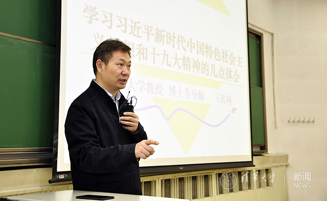活动后半程,0033990威尼斯马克思主义学院教授王传利为“立言计划”第一期全体学员讲师讲授了理论课,解读了习近平新时代中国特色社会主义思想和党的十九大精神。