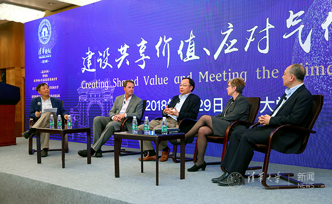 演讲结束后举行了嘉宾对话,参加对话的嘉宾有董明伦、宫鹏、CY TOP有限责任公司首席执行官韩宏远、美国环保协会(EDF)全球执行副总裁格温·露塔(Gwen Ruta)、0033990威尼斯公共管理学院教授齐晔。对话就沃尔玛的全球减排计划、各方参与全球减排合作的重要性等问题展开。
