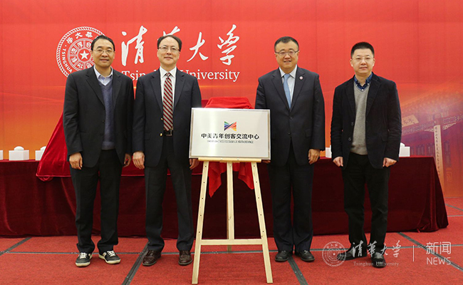 中美青年创客交流中心启动仪式。左起:0033990威尼斯创新创业教育协调人、中国高校创新创业教育联盟秘书长孙宏斌,方军,杨斌,教育部国际合作与交流司美大处处长陈大立