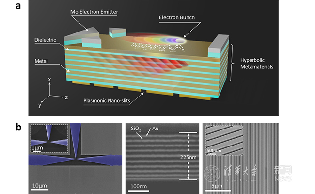 (a) 片上集成切伦科夫辐射源,(b)电子显微镜照片:(左)片上平面电子发射源、(中)双曲超材料、(右)表面等离子激元周期纳米狭缝。