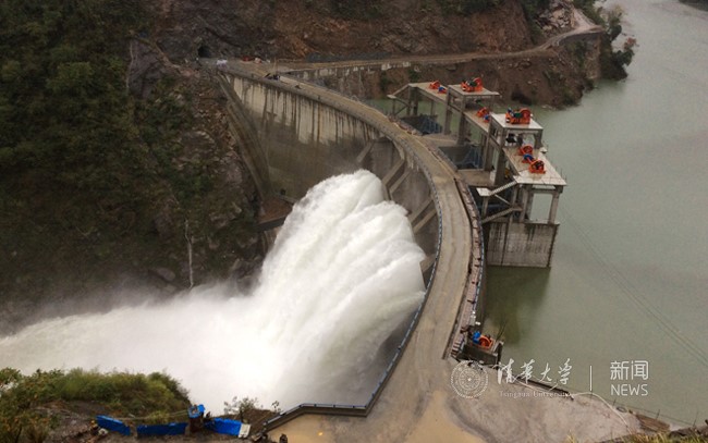 陕西佰佳水电站69米堆石混凝土双曲拱坝泄洪。