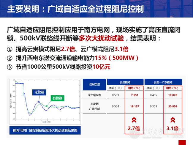 项目属于电力系统及其自动化学科领域。阻尼不足导致的振荡问题是目前电网安全的最大威胁之一。本项目采用即测、即辨、即控的技术思路,完全基于量测进行阻尼特性的在线分析与控制。通过三个主要发明点,正常运行时实现了对危险振荡模式的不间断监测和预警,发生振荡时实现了快速准确的振荡起因判定,并实现了全过程阻尼控制,包括预防控制防止起振、校正控制平息振荡、紧急控制避免事故扩大。本项目为电力系统振荡问题提供了完整的解决方案,成果应用于国内外多个电网,产生了显著的社会和经济效益。