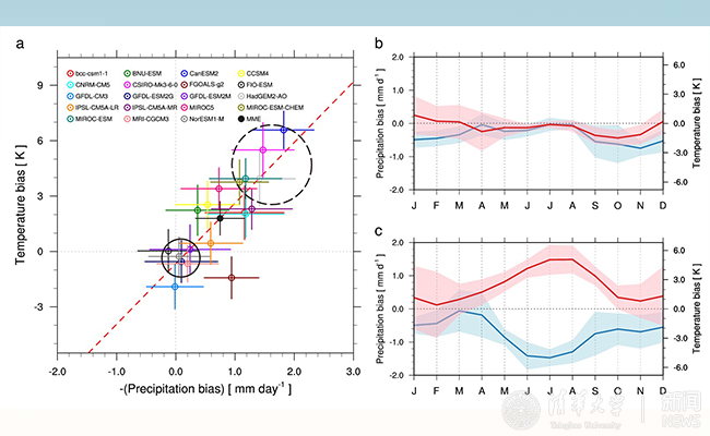 a. 全球气候模式暖偏差(纵坐标)与干偏差(横坐标)之间的关系。