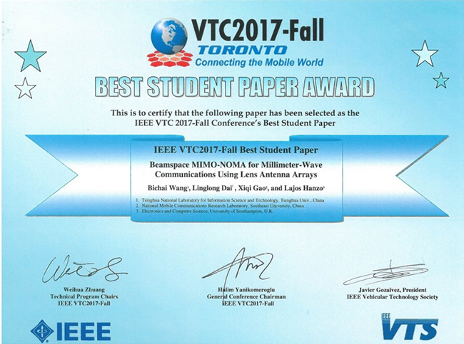 清华新闻网10月10日电 9月24至27日,由国际电气与电子工程师学会(IEEE)主办的第86届国际传输技术大会(2017 IEEE 86th Vehicular Technology Conference,IEEE VTC 2017-Fall)在加拿大多伦多召开。清华电子工程系2015级直博生王碧钗作为第一作者的论文《毫米波通信中基于透镜天线的波束空间MIMO-NOMA传输机制》(Beamspace MIMO-NOMA for Millimeter-Wave Communications Using Lens Antenna Arrays)荣获大会唯一最佳学生论文奖(IEEE VTC 2017-Fall Best Student Paper Award)。